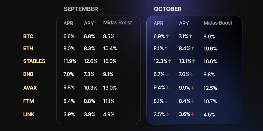 10 października planują podnieść stopy procentowe dla Bitcoin, Ethereum i Stablecoins, a także obniżyć stopy procentowe dla BNB, Avalanche, Fantom i Chainlink, w oparciu o 2-miesięczną średnią rentowność Midasa.