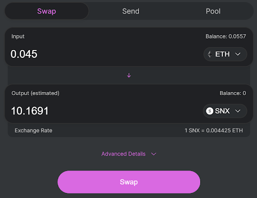 Aby uzyskać sUSD na Uniswap, po prostu przewiń w górę i wykonaj te same kroki, co akwizycja sETH, ale z sUSD jako wyjściem.