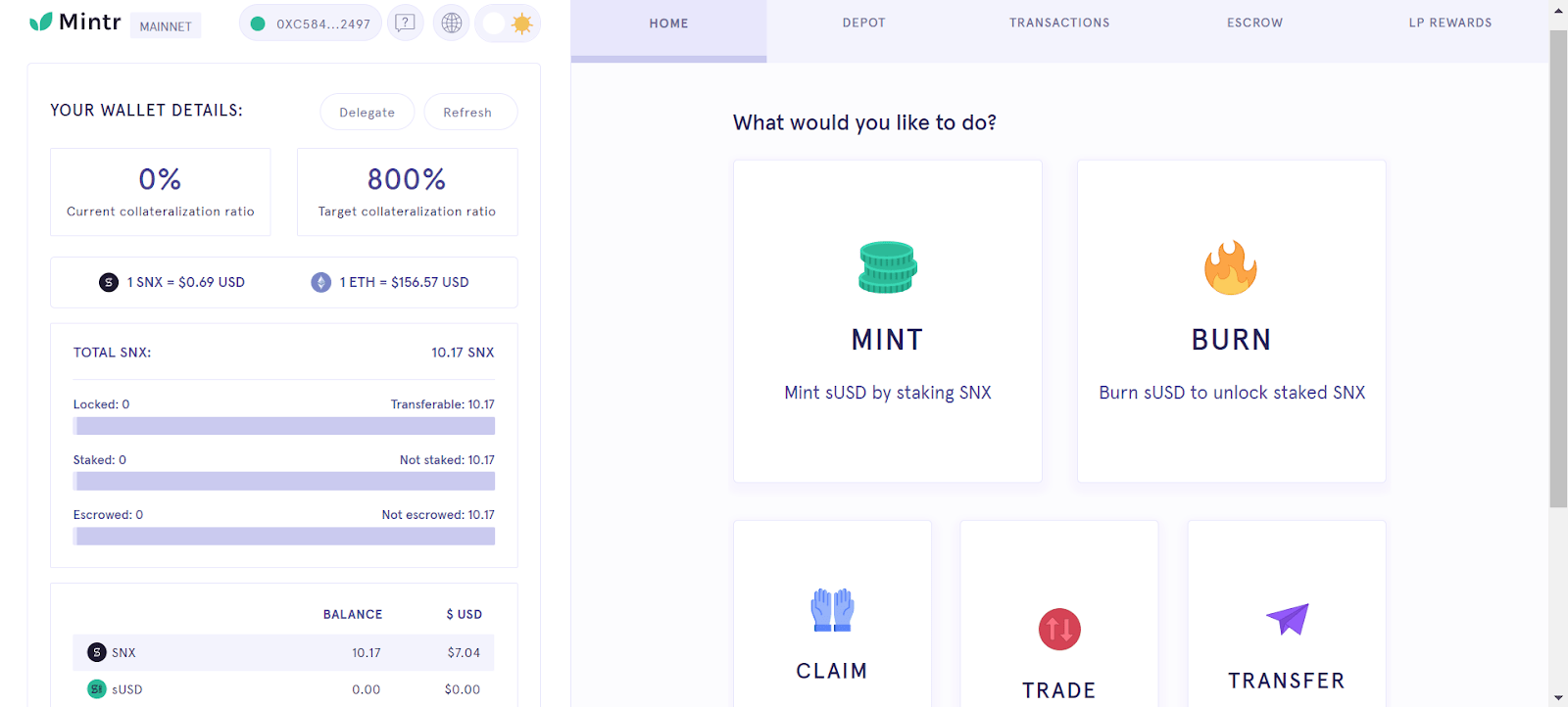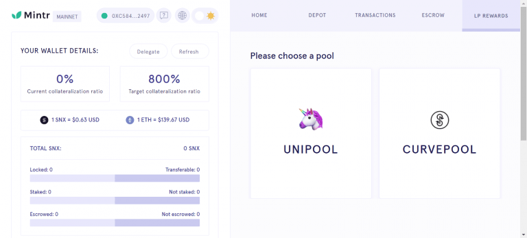 Po uzyskaniu SNX użytkownik otworzy Mintr i połączy się z portfelem zawierającym tokeny. Użytkownicy zobaczą stronę główną ze szczegółami portfela po lewej stronie i opcjami funkcjonalności po prawej stronie.