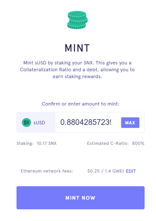 Aby postawić SNX i mennicę sUSD, kliknij pole „MINT”. Wprowadź ilość sUSD, którą chcesz wybić, wyzwalając odpowiedni SNX, który zostanie postawiony. Proszę wziąć pod uwagę szacowany współczynnik zabezpieczenia (współczynnik c) oraz opłaty sieciowe Ethereum. Użytkownicy mogą łatwo postawić cały swój SNX, klikając przycisk „Max” w polu sUSD.