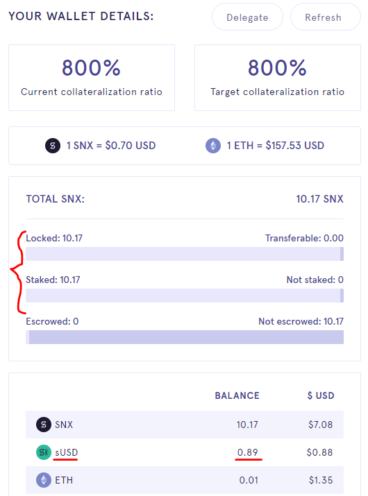 Jeśli staker menniczy sUSD nie handluje nim, skutecznie zmniejsza globalny portfel, ponieważ jest narażony na wzrost globalnego długu bez potencjalnego wzrostu portfela syntezatorów. Nie ma nic złego w tym pozycjonowaniu na rynku, ale niektórzy początkujący stakerzy nie zdają sobie sprawy, że są narażeni na globalne portfolio.