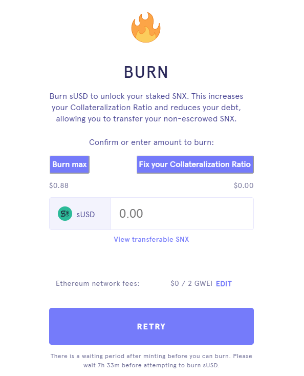 Aby zatrzymać tyczenie i zwolnić SNX, kliknij opcję „BURN” na stronie głównej Mintr. Stąd użytkownicy mogą nagrać dowolną ilość sUSD lub kliknąć „FIX YOUR COLLATERALIZATION RATIO”, aby automatycznie wybrać kwotę sUSD, która doprowadzi pozycję do docelowego współczynnika. Ilość odblokowanego SNX będzie proporcjonalna do wypalonego sUSD i oparta na współczynniku zabezpieczenia.