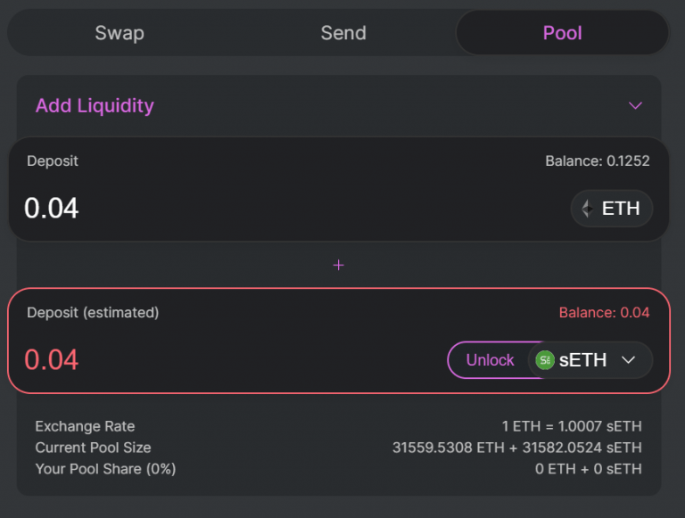 Aby zdobyć tokeny LP, otwórz https://uniswap.exchange/add-liquidity i upewnij się, że wybrana jest karta „Pula”. ETH zostanie automatycznie wybrany w górnym wierszu i wybierz SETH z menu rozwijanego na dole. Użytkownicy będą musieli nacisnąć „Odblokuj” obok sETH, aby zapewnić inteligentne zatwierdzenie umowy.