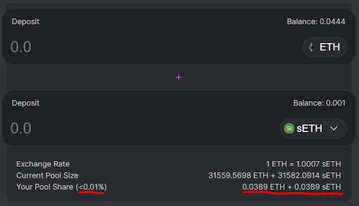 Wprowadź kwotę sETH, aby dodać do puli płynności. Wartość ETH na górze zostanie automatycznie wypełniona na podstawie bieżącego kursu wymiany pokazanego na dole. Po potwierdzeniu kwoty wpłaty kliknij „Dodaj płynność” i zatwierdź monit o transakcję. Po potwierdzeniu transakcji użytkownicy zobaczą, że ich udział w puli jest aktualizowany o procent i całkowitą kwotę ETH + SETH.