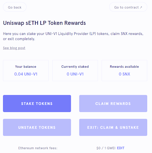 Transakcja automatycznie obstawi ETH i SETH w umowie Uniswap i w zamian wyśle tokeny dostawcy płynności ( UNI-V1 ) do podłączonego portfela. Następnie otwórz https://mintr.synthetix.io/ i podłącz ten sam portfel. Wybierz zakładkę „Nagrody LP” w prawym górnym rogu i kliknij opcję Unipool.