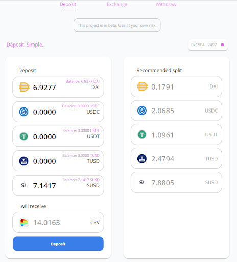 Po uzyskaniu sUSD przejdź do https://iearn.finance/pool i połącz się z obsługiwanym portfelem, który został użyty do nabycia sUSD. iEarn obsługuje obecnie między innymi portfele MetaMask , Ledger i Trezor. Po połączeniu kliknij „Depozyt”, aby wyświetlić salda tokenów po lewej stronie i zalecany podział na dodanie płynności po prawej stronie.