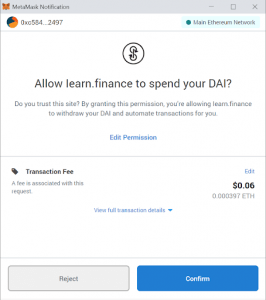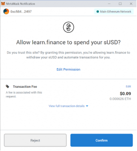 Po potwierdzeniu tych transakcji, które pozwalają iEarn na przeniesienie aktywów z portfela, automatycznie pojawi się kolejny monit z powiadomieniem o „interakcji z umową”. Potwierdź tę transakcję, aby aktywa zostały postawione w inteligentnych kontraktach iEarn w zamian za tokeny sUSD / y.Curve.fi, które są automatycznie deponowane w podłączonym portfelu.