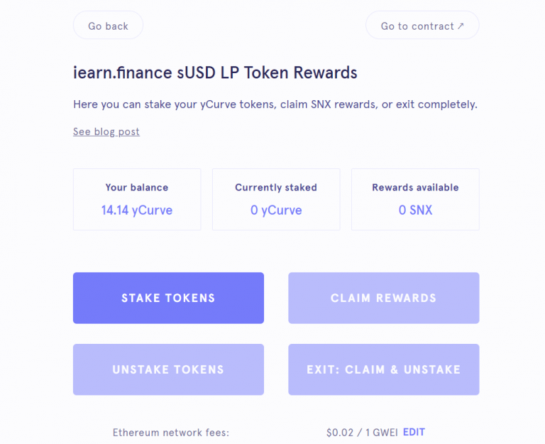 Po potwierdzeniu użytkownicy zobaczą saldo swojego tokena yCurve, aktualnie postawioną kwotę oraz wszelkie zgromadzone nagrody SNX. Po prostu wybierz opcję „Stake Tokens” i potwierdź transakcję, aby co tydzień otrzymywać nagrody SNX.