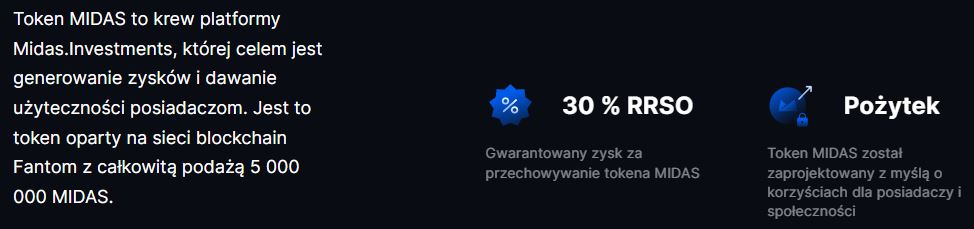 Token MIDAS to krew platformy Midas.Investments, której celem jest generowanie zysków i dawanie użyteczności posiadaczom. Jest to token oparty na sieci blockchain Fantom z całkowitą podażą 5 000 000 MIDAS. Posiadacze tokenów MIDAS otrzymują 30% RRSO i mają dodatkowe korzyści w ramach interakcji z platformą.