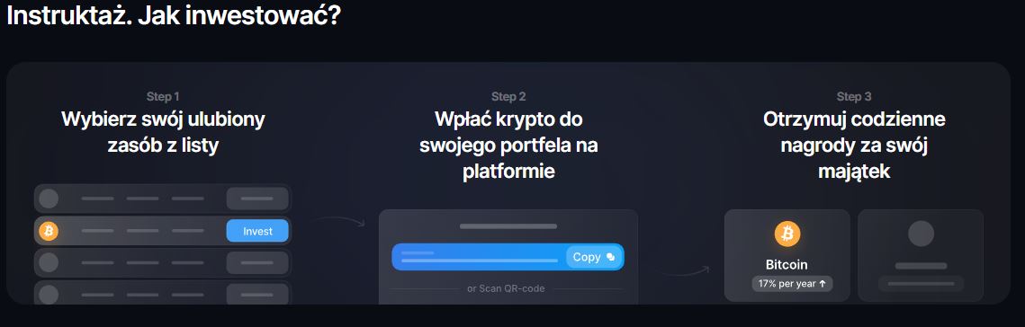 - Aby zacząć zarabiać, wystarczy wpłacić środki na wskazany adres lub kupić je za BTC.