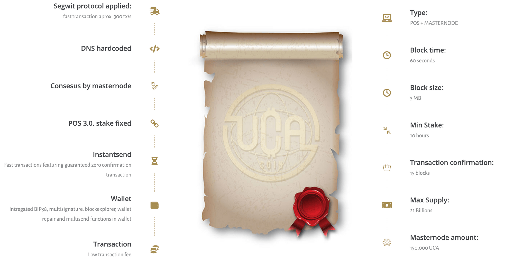 UCA stosuje unikalne podejście do budowy solidnej sieci. Tworząc związek i sojusz globalnych partnerów, zespół dąży do zbudowania stabilnej kryptowaluty z gwarantowanym długoterminowym sukcesem. Jego mantra „silniejsi razem” traktuje priorytetowo globalną dystrybucję i to właśnie czyni projekt wyjątkowym. Projekt rozwija się na 8 solidnych filarach; Partnerzy Allianz, Społeczność, zespół ekspertów, karta UCA, aplikacja UCA, zielona technologia, sklep internetowy oraz bankomaty i płatności POS.