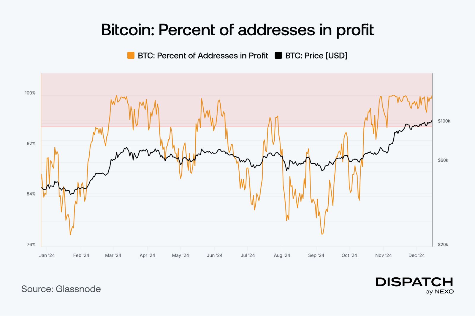 Ponadto cena Bitcoina jest notowana powyżej górnego pasma Bollingera w większości przedziałów czasowych, co wzmacnia siłę trwającego trendu. Jednak na tych wysokich poziomach korekta panującego trendu może być na horyzoncie — naturalny kierunek działań w krótkim okresie, z podażą Bitcoina w zysku na poziomie stratosferycznych 97%.