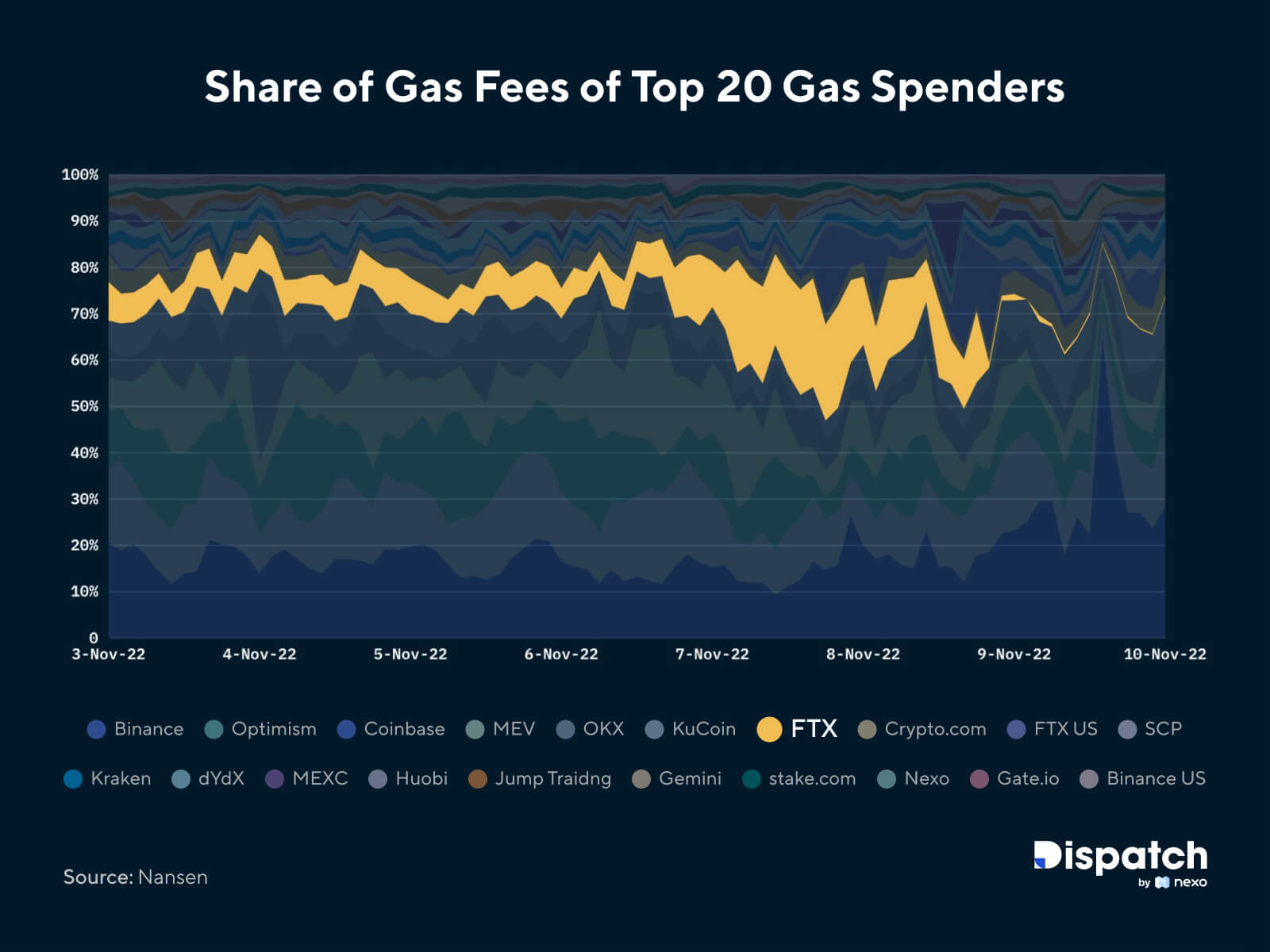 Zanim FTX wstrzymał wypłaty, przetwarzał szokującą liczbę wypłat – ponad 6 miliardów dolarów w ciągu jednego dnia. Jednym z interesujących sposobów wizualizacji jest zrobienie migawki opłat za gaz Ethereum w danym okresie. Na poniższym wykresie widzimy, że wypłaty (wyrażone w opłatach za gaz) gwałtownie wzrosły po komentarzach CZ w niedzielę, zanim spadły prawie do zera, ponieważ wypłaty zostały wstrzymane od wtorku do środy. Nasze serca kierują się do wszystkich, którzy mają aktywa utknięte w FTX. Mamy nadzieję na szybkie rozwiązanie dla wszystkich ich klientów.
