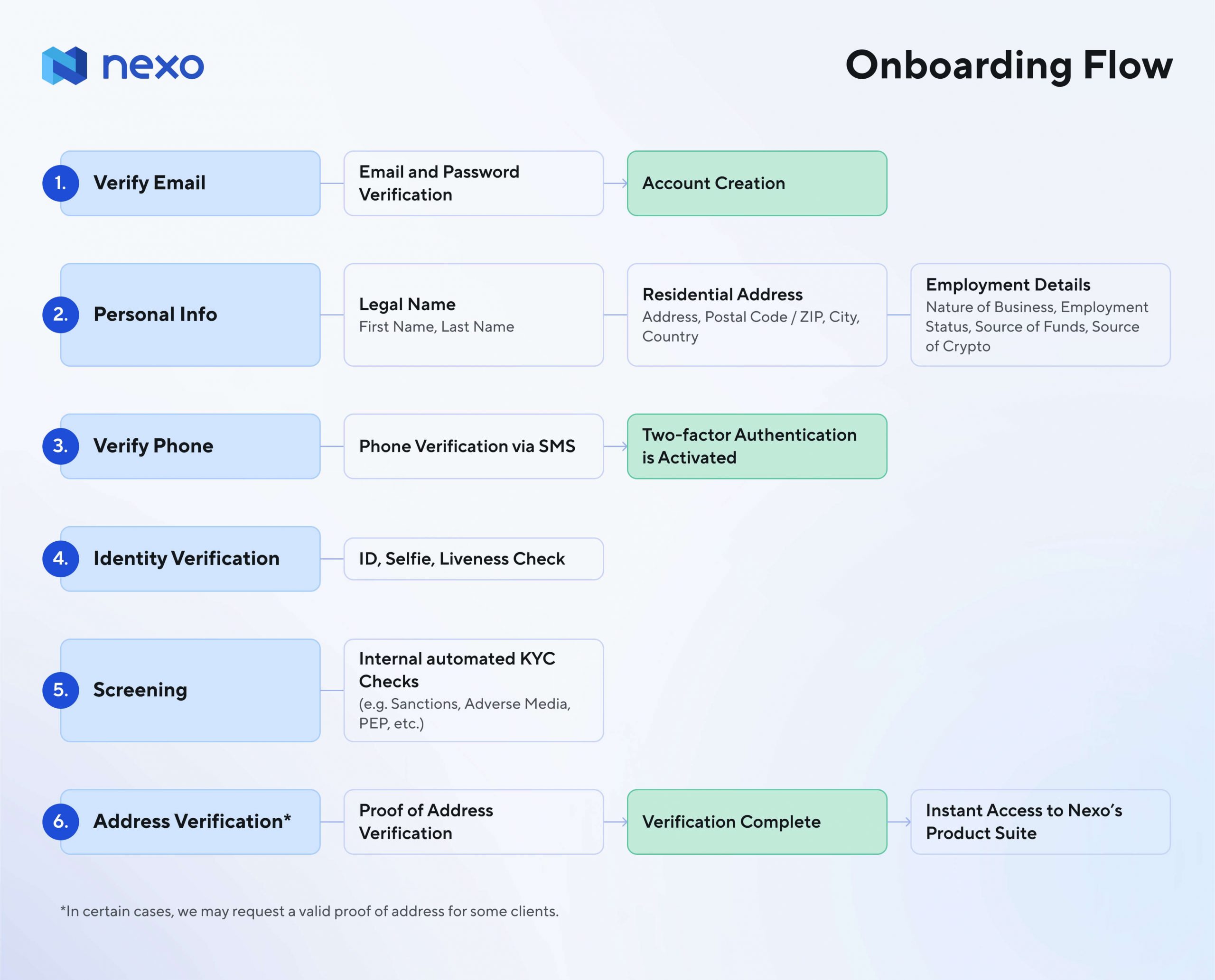 Ciężko pracowali, aby zapewnić klientom doskonałe wrażenia użytkownika w ramach intuicyjnego interfejsu, zapewniając jednocześnie, że nadal przestrzegają najwyższych standardów, jeśli chodzi o obowiązki regulacyjne. Poniżej znajdziesz kluczowe kroki i elementy rygorystycznych procesów wdrażania i weryfikacji NEXO.