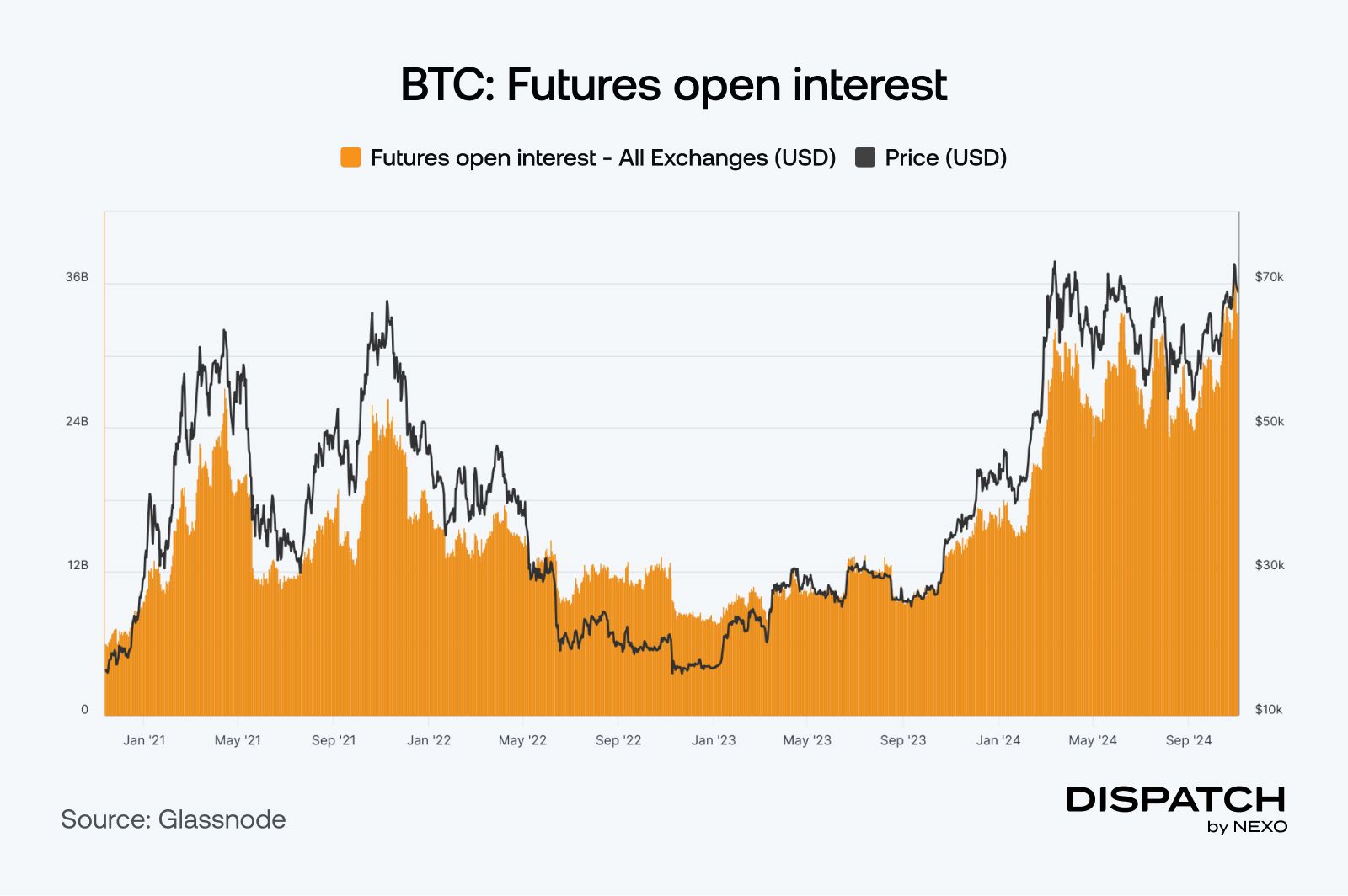 Pod koniec października Bitcoin wzrósł powyżej 72 000 USD, najwyższego poziomu od czerwca, co zbiegło się z rekordowym wzrostem otwartych pozycji na kontraktach terminowych na Bitcoina (OI). Wskazuje to na wzmożoną aktywność rynkową traderów i inwestorów. Podczas gdy podwyższony OI może prowadzić do zwiększonej zmienności, stopy finansowania na rynku kontraktów terminowych pozostają poniżej marcowych szczytów, co sugeruje, że rynek jest ostrożnie optymistyczny, a nie przegrzany.