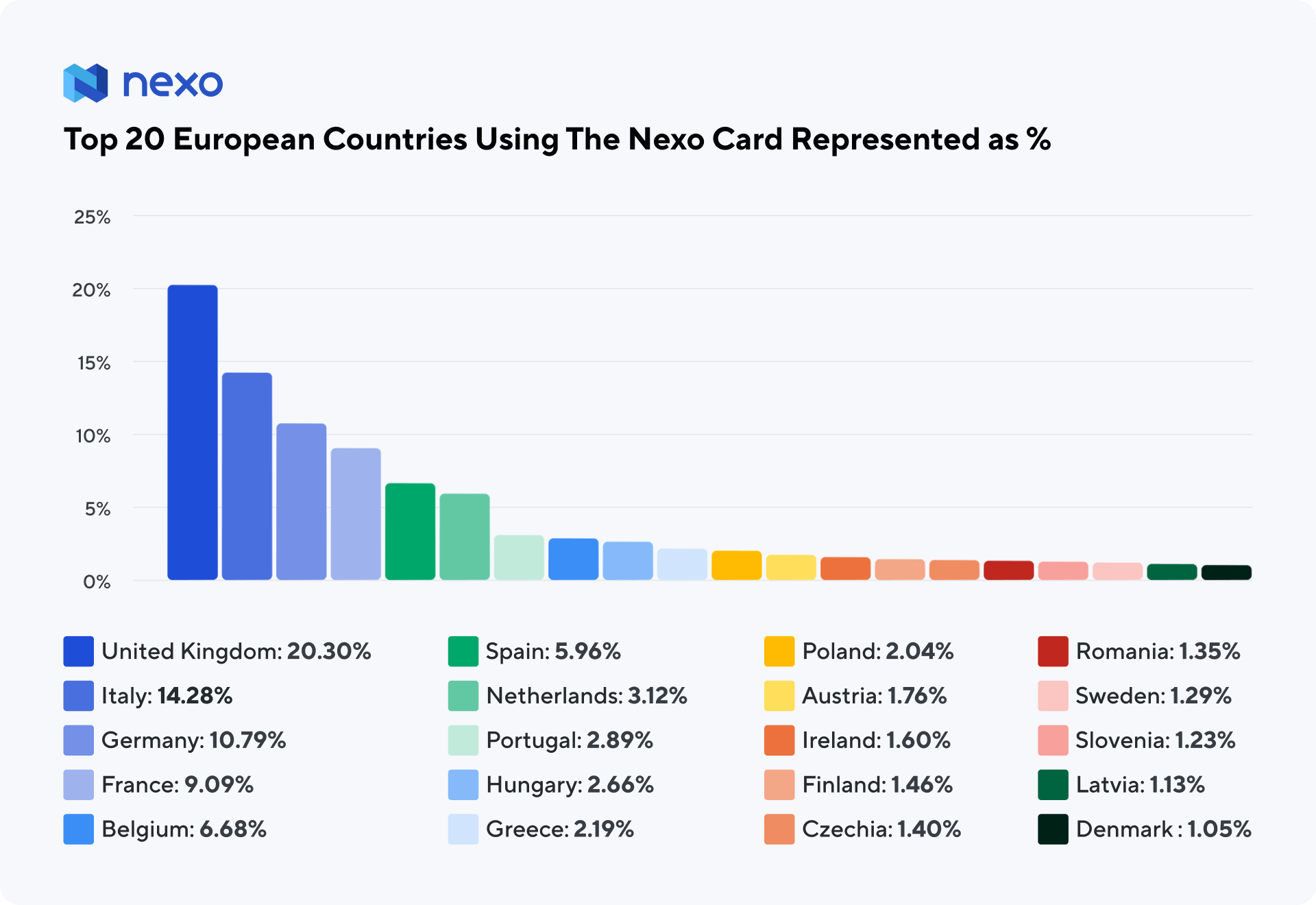 Top 20 europejskich krajów korzystających z Nexo Card.