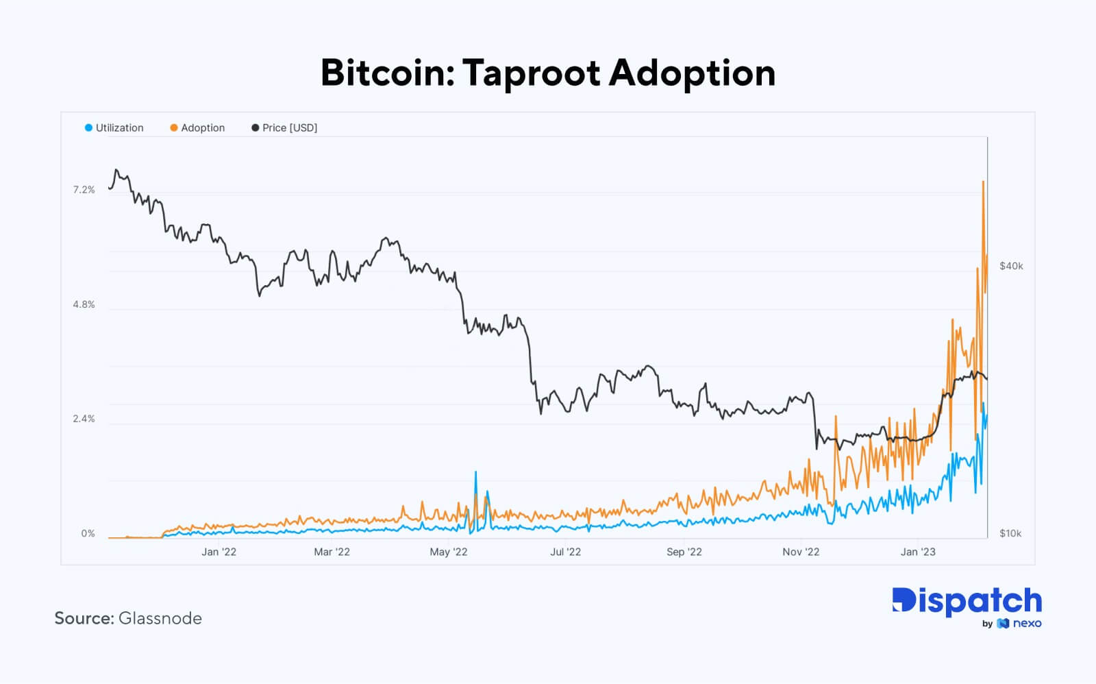 Według Glassnode w ostatnim miesiącu adopcja Taproot wzrosła z około 2% do 7,47%.