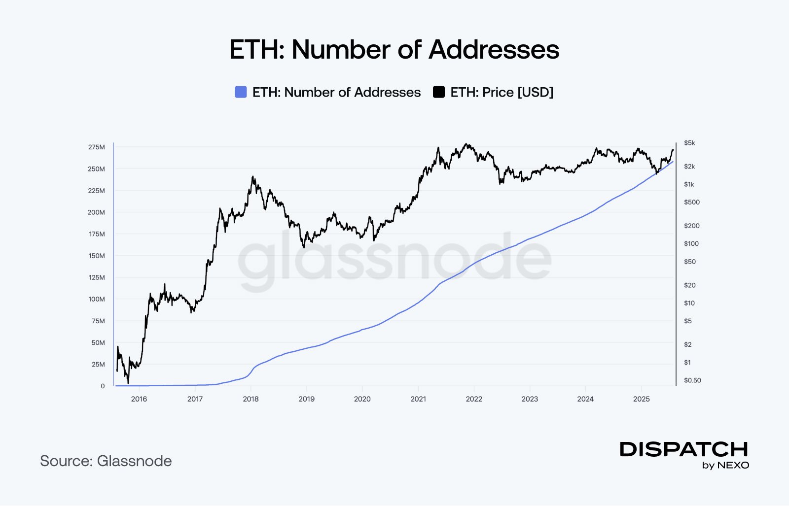 Blisko dziesiątych urodzin, Ethereum wciąż dodaje nowe świece – i adresy. Sieć właśnie przekroczyła 250 milionów unikalnych adresów, a co tydzień tworzonych jest prawie milion nowych. To wzrost o 33% w porównaniu z rokiem poprzednim, co wskazuje na cichą, ale stałą adopcję napędzaną przez warstwy 2, staking i aktywność DApp. To wyraźny sygnał, że ekosystem Ethereum rozwija się szybciej i głębiej niż kiedykolwiek.
