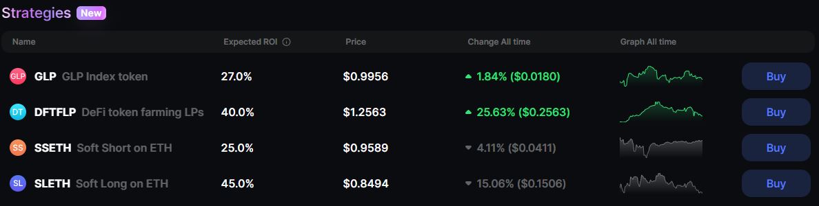 Strategia DeFi, która generuje zysk w ETH, zapewniając płynność blue chipów dla lewarowanych traderów na GMX, zdecentralizowanej giełdzie wieczystej. Użytkownicy dostarczają płynność do indeksu o nazwie GLP i zarabiają na opłatach generowanych z likwidacji handlowców, swapów, a także zysku ze strat handlowców.