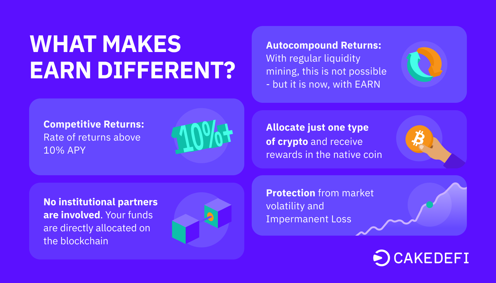 Podobnie jak inne usługi Cake DeFi, EARN jest również łatwy w użyciu, przejrzysty i bezpieczny. Łączy również wszystkie znane korzyści płynące z wydobywania i pożyczania płynności, niektóre z ich procesów i koncepcje za nimi stojące.