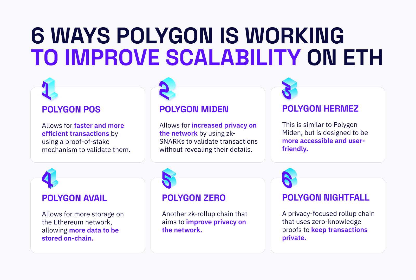 Jednym ze sposobów, w jaki Polygon pracuje nad poprawą skalowalności Ethereum, są różne rozwiązania skalowania . Obejmują one: