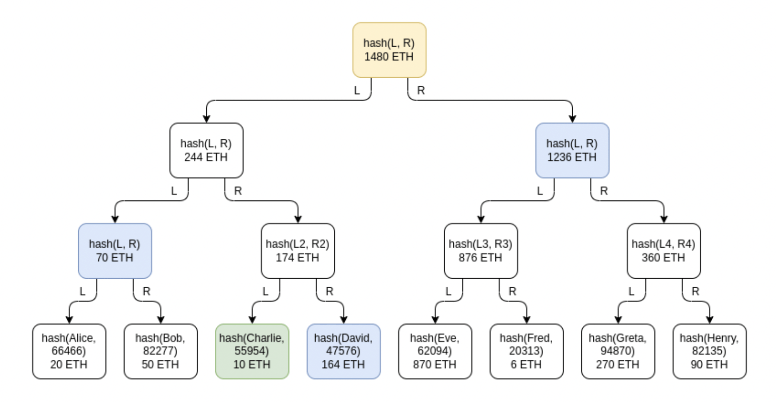Drzewo Merkle to struktura danych, która jest tworzona przez połączenie salda klienta i skrótu nazwy użytkownika w strukturę drzewa, w której każdy węzeł reprezentuje parę (hash, saldo). Węzły liści na dole drzewa reprezentują salda poszczególnych klientów i zaszyfrowaną nazwę użytkownika. Węzły znajdujące się wyżej w hierarchii mają saldo równe sumie dwóch sald poniżej, a hash jest sumą dwóch węzłów poniżej.