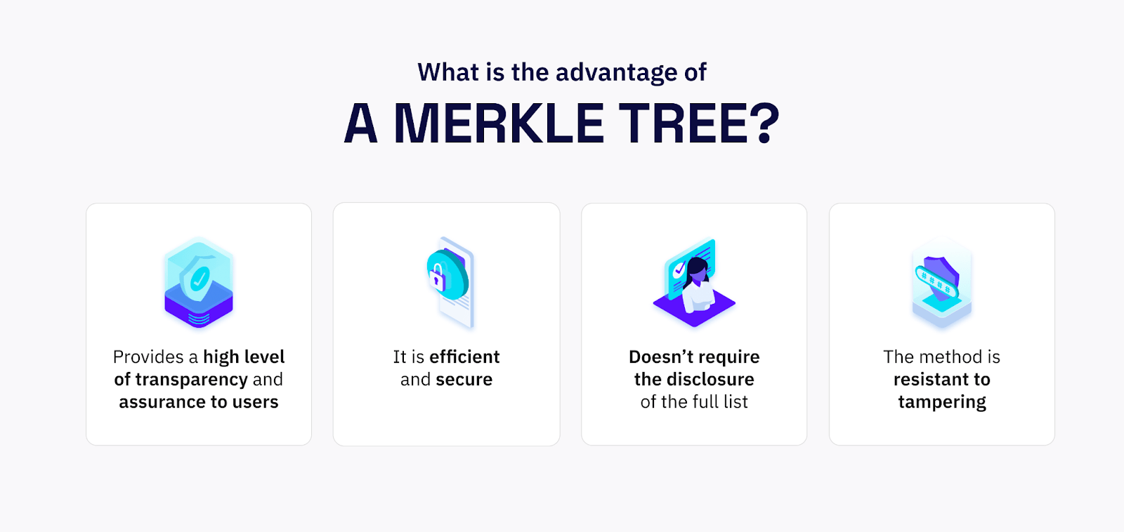 Kolejną zaletą jest to, że jest wydajny i bezpieczny. Wykorzystanie drzewa Merkle pozwala na sprawną weryfikację całej listy aktywów, bez konieczności ujawniania pełnej listy. Chroni to prywatność giełdy i jej użytkowników, jednocześnie umożliwiając weryfikację rezerw giełdy.