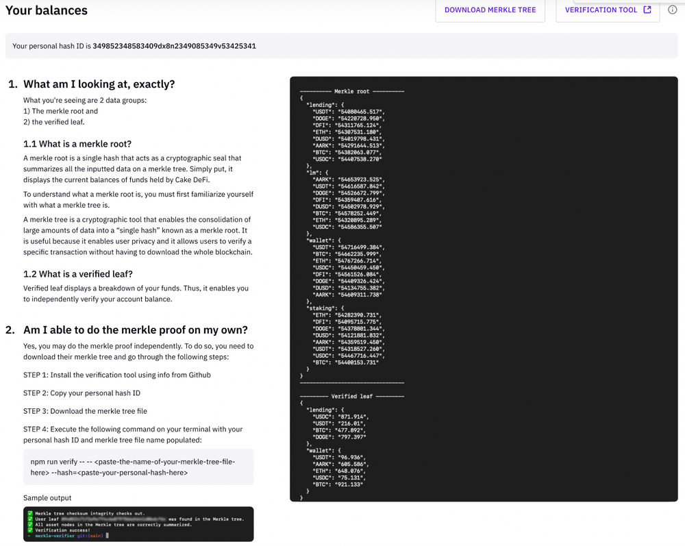 Obejmuje to dwa zestawy danych: pierwszy to korzeń Merkle, który działa jak pieczęć kryptograficzna podsumowująca wszystkie imputowane dane (bieżące saldo środków posiadanych przez Cake DeFi), a drugi to zweryfikowany liść, który pokazuje podział Twoich funduszy.