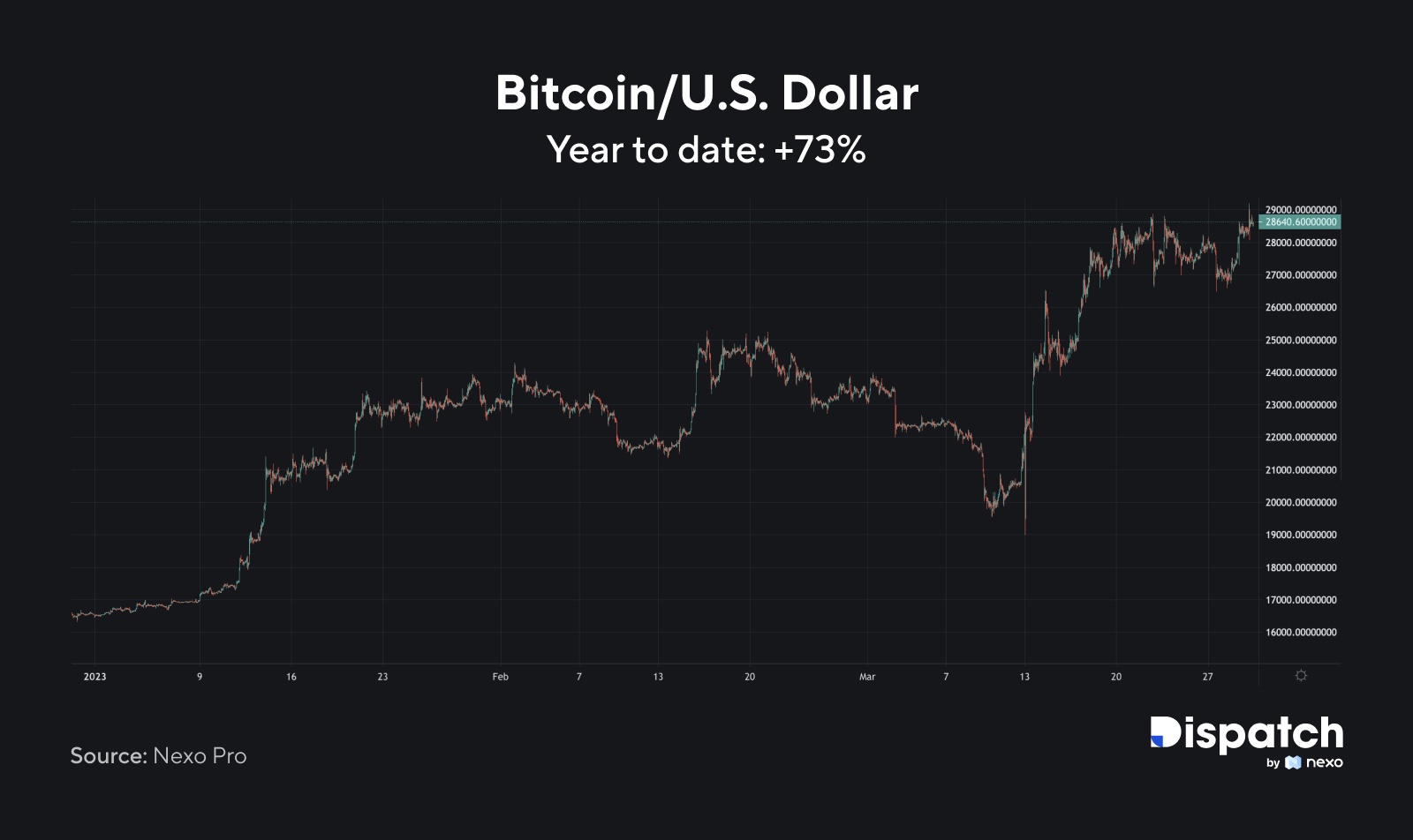 Pod koniec ubiegłego roku, w następstwie upadku FTX, wielu obserwatorów rynku uważało, że Bitcoin może spaść do 10 000 USD. Zamiast tego Bitcoin zamyka pierwszy kwartał 2023 r. ze wzrostem o ponad 70% – to najlepszy kwartał od dwóch lat. Co się dzieje? Częściowo jest to niewielkie przesunięcie w makro. Kryzys bankowy przekonał rynki, że Fed musi wkrótce zakończyć swój cykl podwyżek, co doprowadziło do 14-procentowego wzrostu indeksu Nasdaq w kwartale. Wydaje się, że ta narracja napędza BTC, a nawet publikacje głównego nurtu, takie jak WSJ, wskazują, że Bitcoin szybuje w górę, podczas gdy banki upadają .